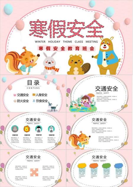 粉蓝雪山儿童滑冰跳跃寒假安全班会PPT模板