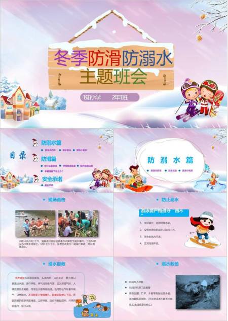 木质牌匾滑雪儿童防滑防溺水班会PPT模板