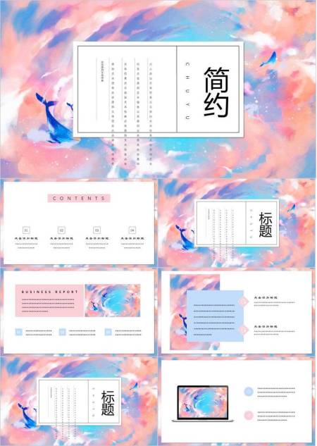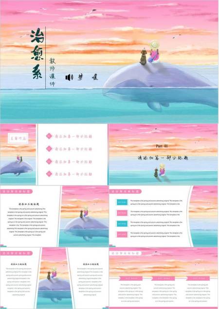 粉色梦幻水彩云霞鲸鱼动漫清新简约PPT模板