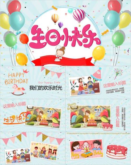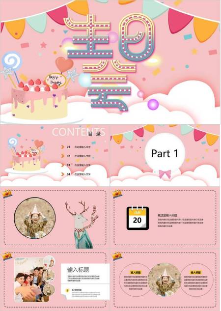 高饱和彩旗蛋糕儿童生日邀请函PPT模板