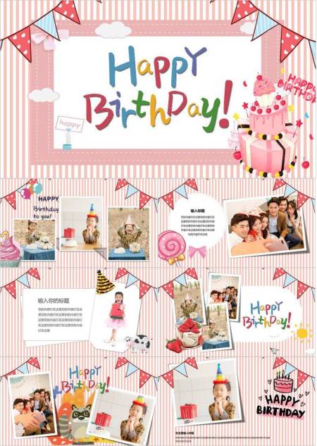 粉色条纹蛋糕儿童生日邀请函PPT模板