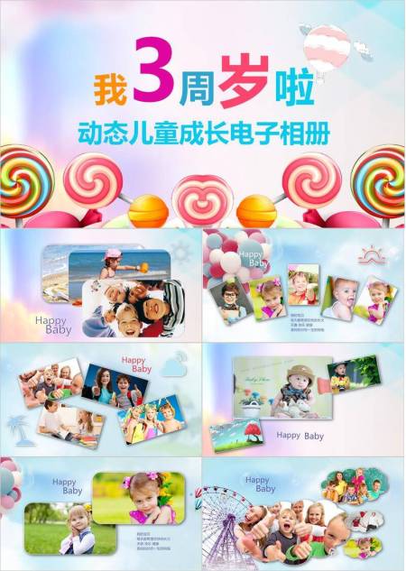 彩虹棒棒糖3岁生日电子相册PPT模板