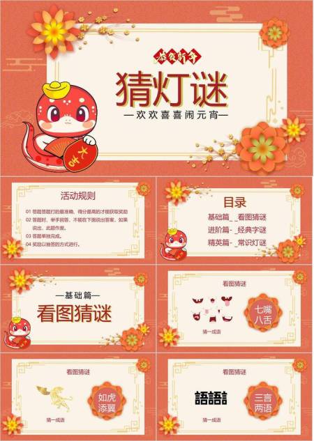 蛇形吉祥物传统纹样边框猜灯谜活动PPT模板