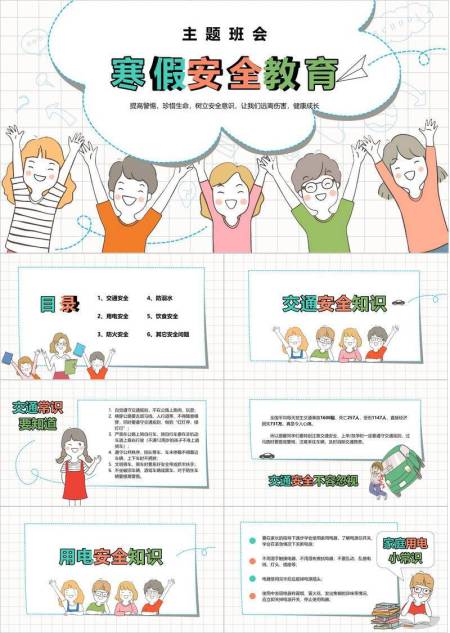 学生欢呼云朵气泡手绘寒假安全教育班会PPT模板