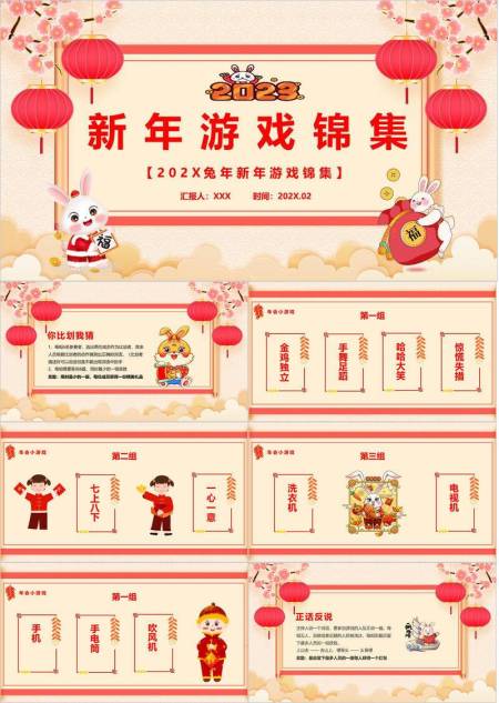 波浪纹樱花兔福牌红包兔年游戏锦集PPT模板