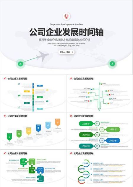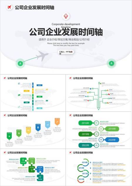 世界地图飞机轨迹简约企业介绍通用时间轴PPT模板