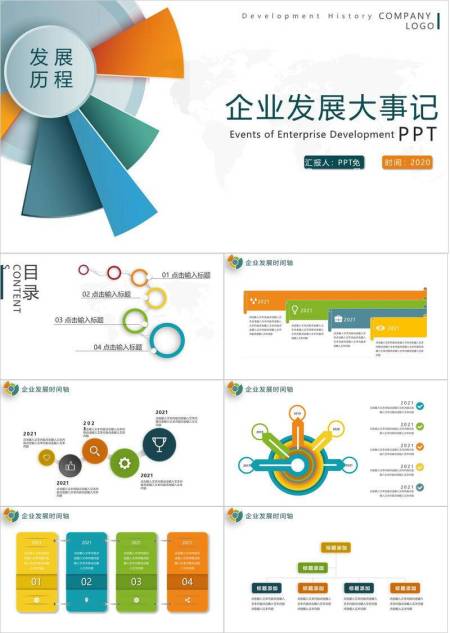 多色扇形世界地图企业年度发展回顾时间轴PPT模板