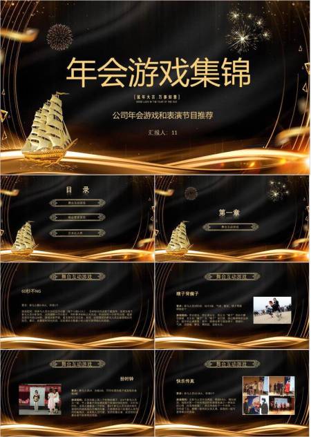 黑金光效帆船烟花鼠年游戏集锦PPT模板