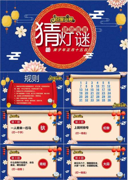 蓝色系祥云花朵灯笼元宵猜灯谜PPT模板