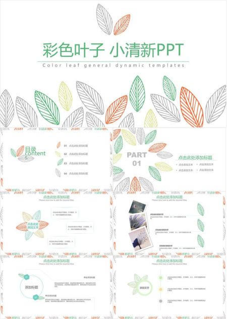 彩色叶片小清新背景PPT