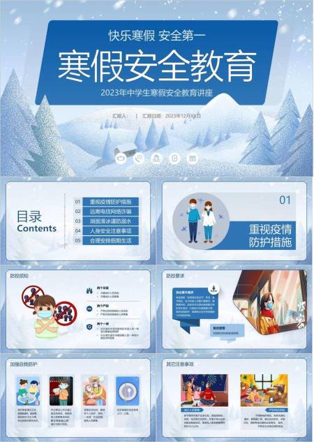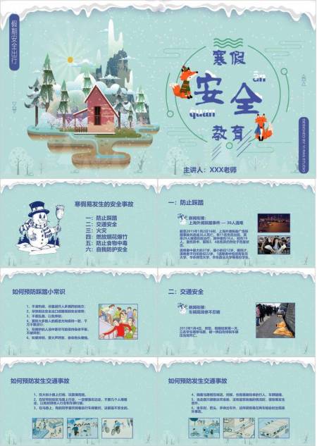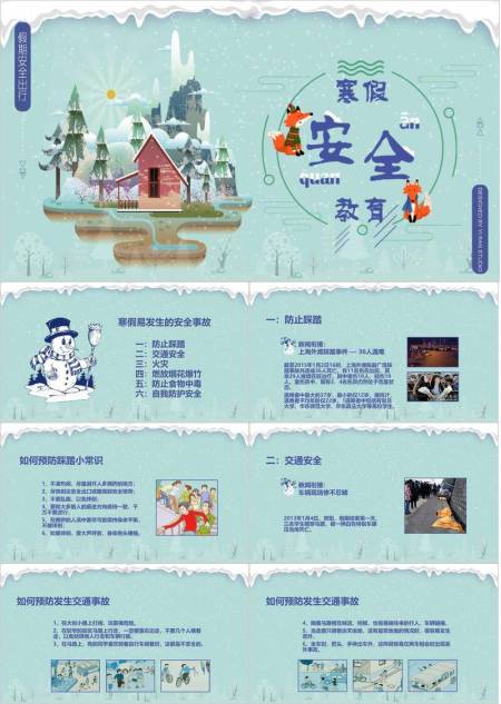 冰凌边框山水狐狸寒假安全创意封面PPT模板